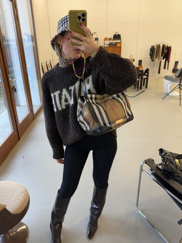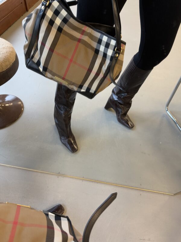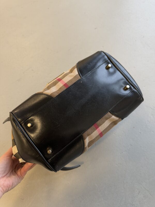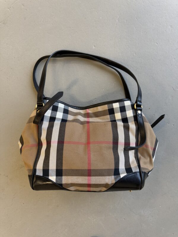 Vintage Burberry Canterbury tote in classic Burberry Haymarket checkered print. Cloth bag with black leather details and straps. Burberry golden metal logo plate on the front. Bag closes with a magnet. Comes with dust bag. Bag is in excellent condition, no real signs of use.