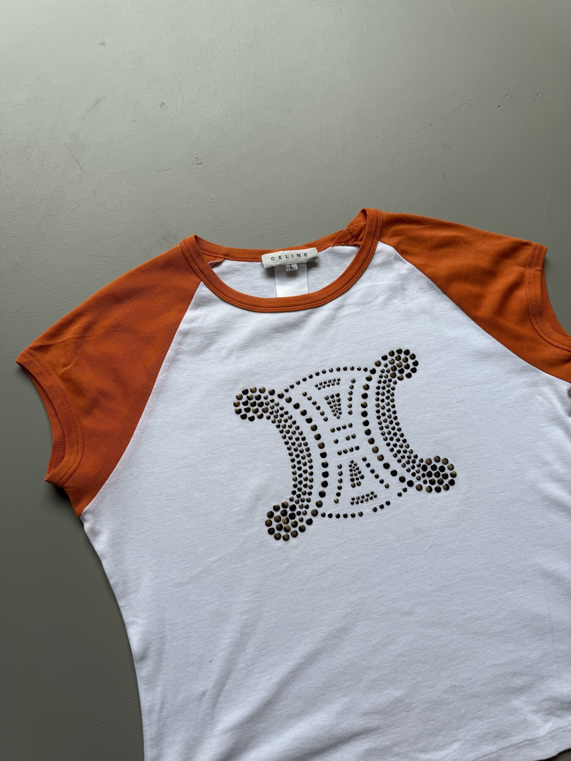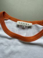 Vintage Celine t-shirt in white jersey with bright orange sleeves and Studded Triomphe logo. Size L, fits size M best. Top is in amazing condition. Composition label has faded a bit.
