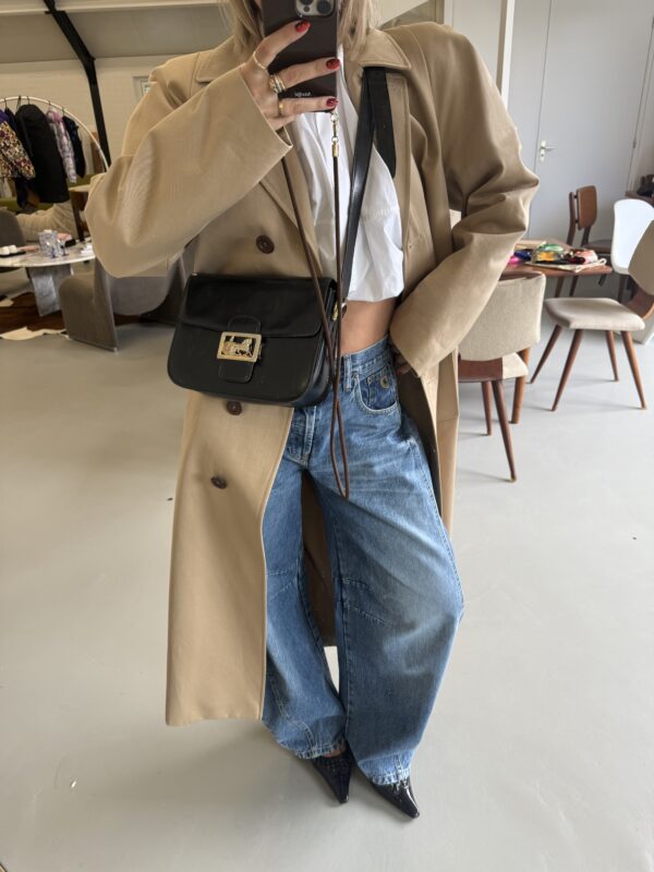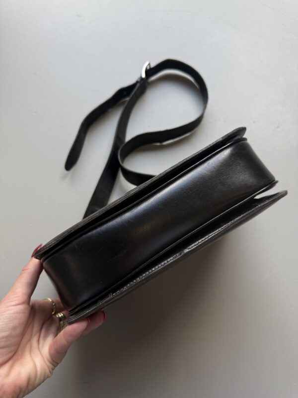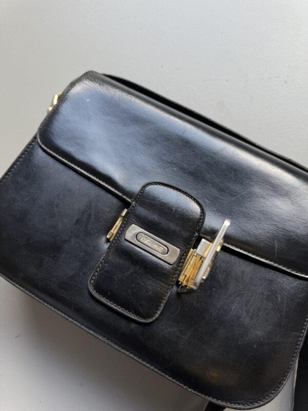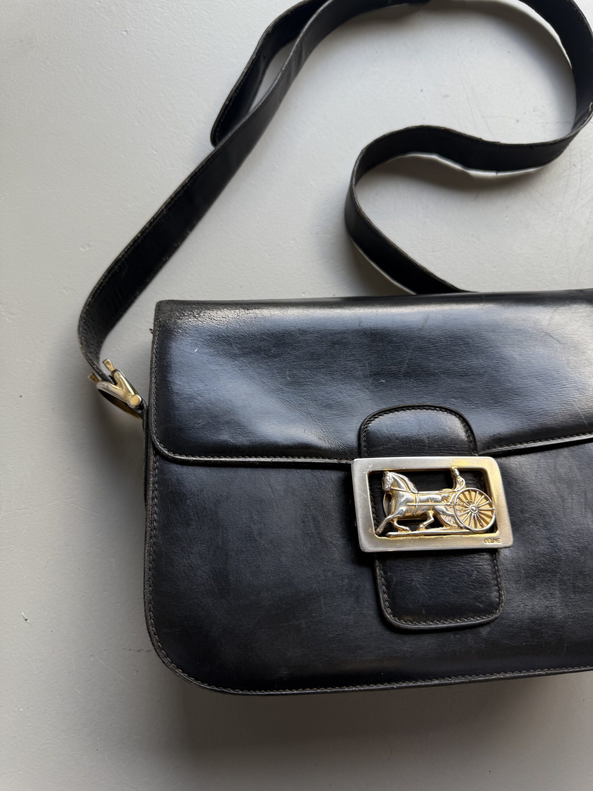 Vintage Céline Horse Carriage crossbody bag in black leather with golden metal hardware. Squarish leather flap bag which closes with a metal logo closure. Multiple compartments inside. Bag is in used but good vintage condition. Scratches on the front and back of the bag (no deep scratches). Some dry spots on the upper corners of the bag and the leather strap. Golden metal hardware shows some signs of discoloration. No broken parts. Vintage but still beautiful.