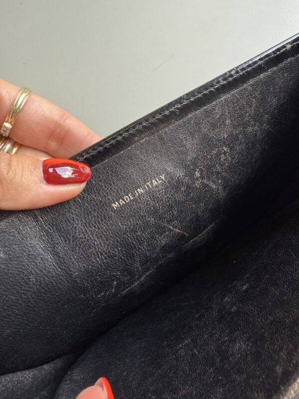 Signs of use: Scratches on the front and back of the bag (no deep scratches). Some dry spots on the upper corners of the bag and the leather strap. Golden metal hardware shows some signs of discoloration. No broken parts. Vintage but still beautiful.