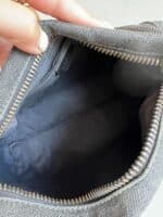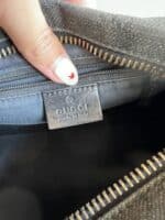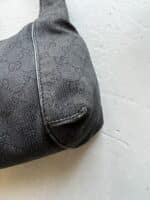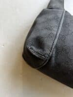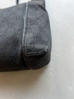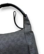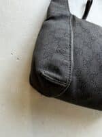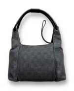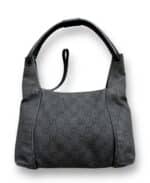 Vintage Gucci bag with GG monogram on grey/black denim. Black leather strap and silver metal details. Bag closes with a zipper. Perfect shoulder bag in very good condition. Very light signs of rubbing on the corners as seen in the pictures.