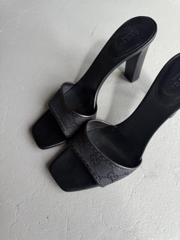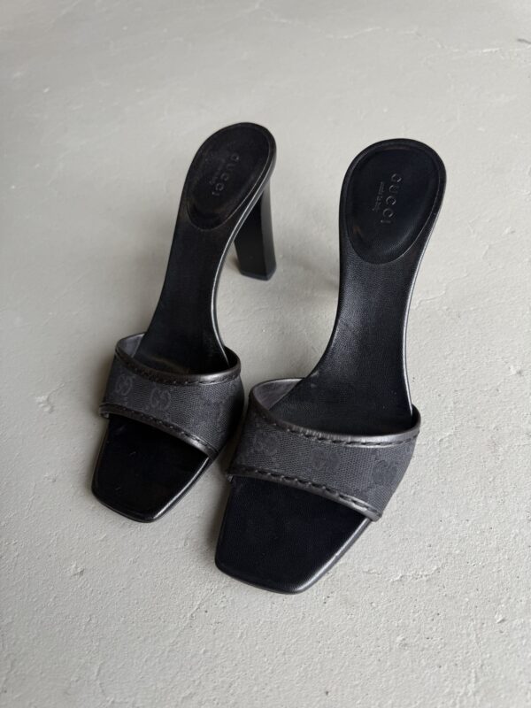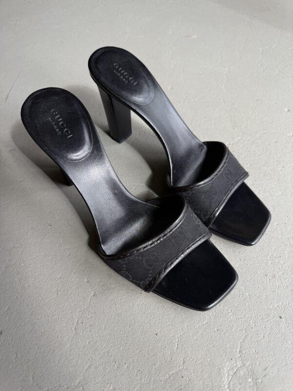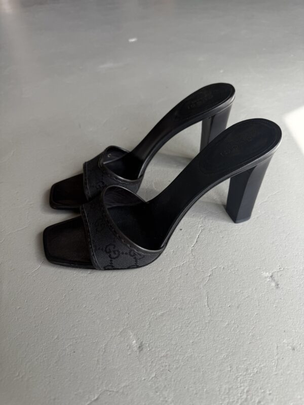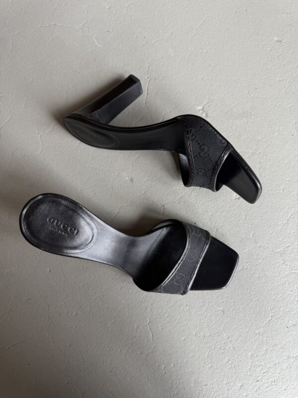 Vintage Gucci mules with GG cloth monogram in black. Black 10 cm wooden block heel. Eu size 39,5. Mules are in excellent condition. Only signs of use on the bottom soles.