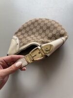 Vintage Gucci GG Round Mini Bag in classic Gucci GG Monogram with crème leather details and golden metal hardware. Mini bag in a round shape which closes with a zipper. Leather handle with metal buckle detail. Bag is in amazing condition. No signs of use. Very light mark of glue along the edge on one leather part on the back of the bag (original glue from manufacturing the bag which colored a bit brownish after time). Very minimal and unnoticeable.