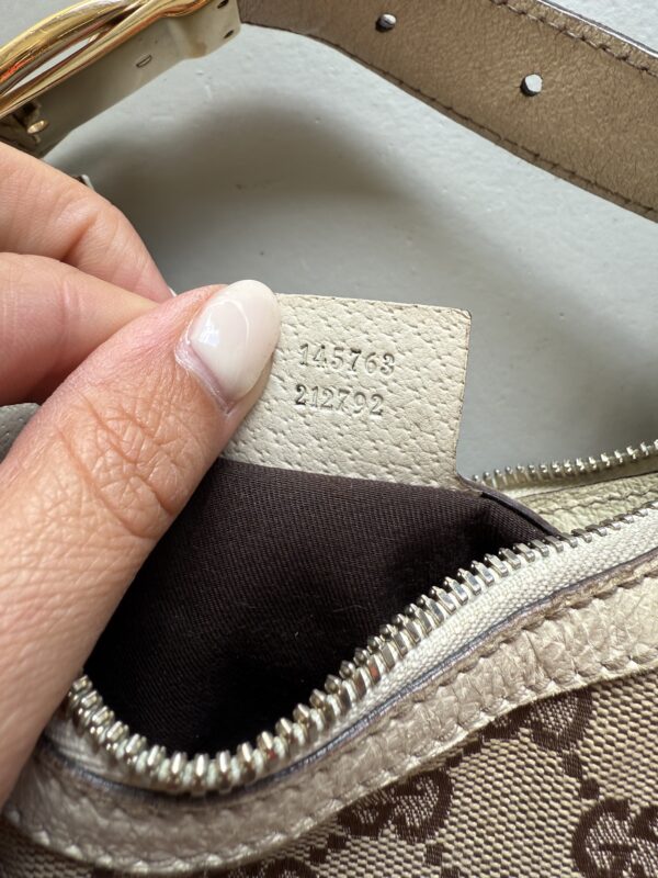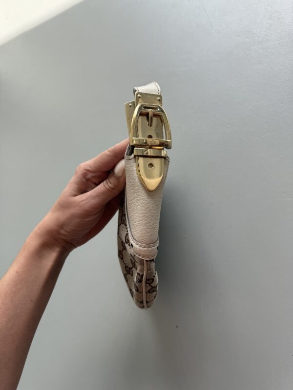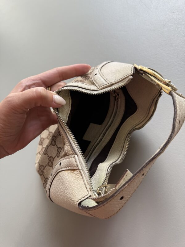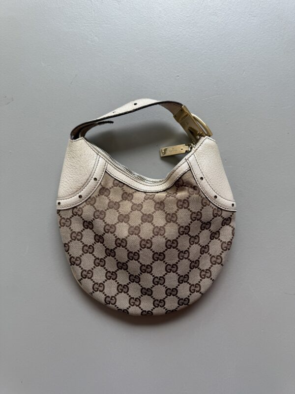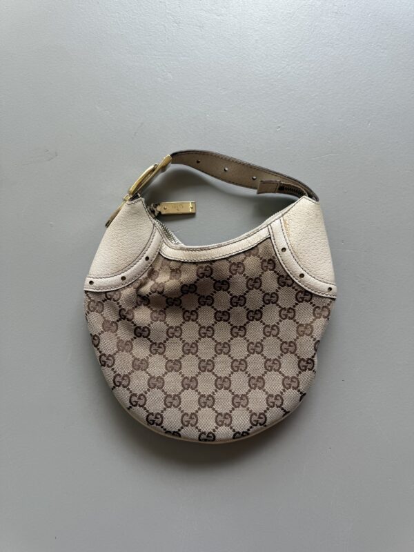 Vintage Gucci GG Round Mini Bag in classic Gucci GG Monogram with crème leather details and golden metal hardware. Mini bag in a round shape which closes with a zipper. Leather handle with metal buckle detail. Bag is in amazing condition. No signs of use. Very light mark of glue along the edge on one leather part on the back of the bag (original glue from manufacturing the bag which colored a bit brownish after time). Very minimal and unnoticeable.