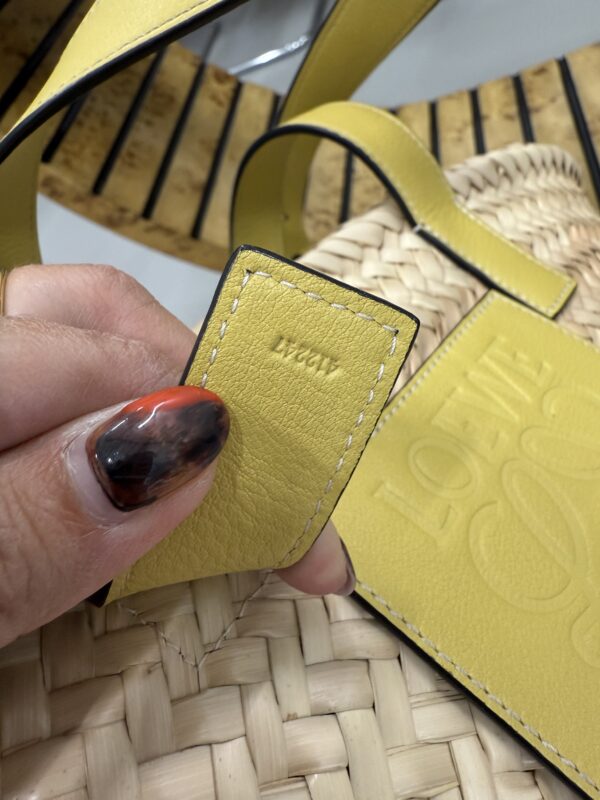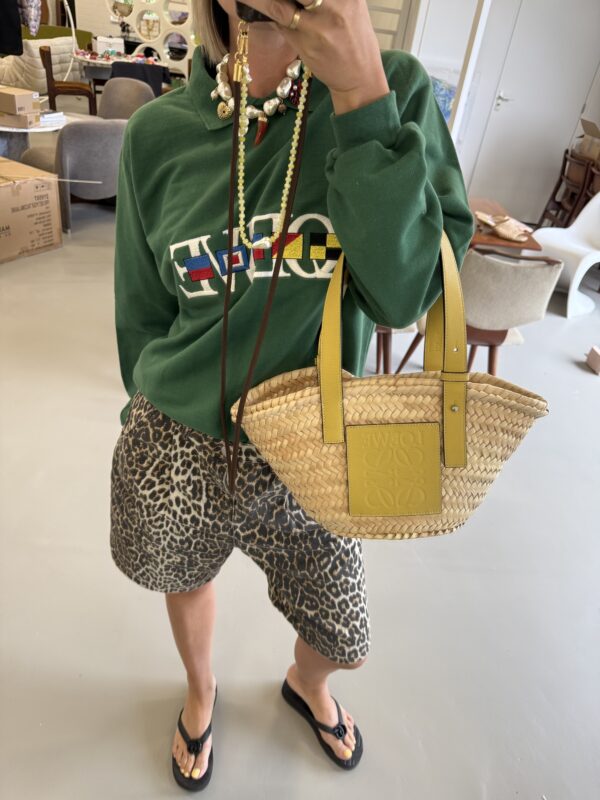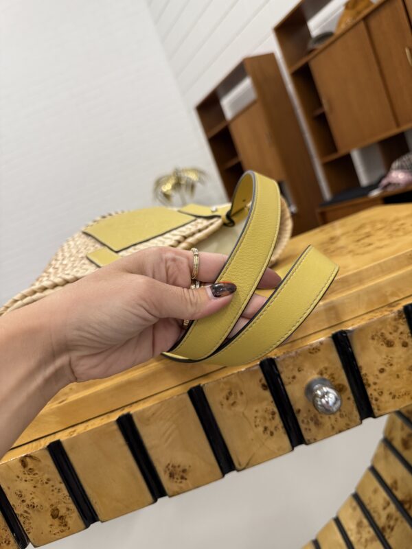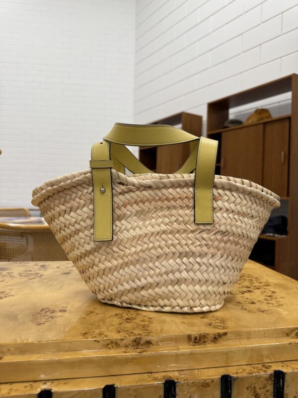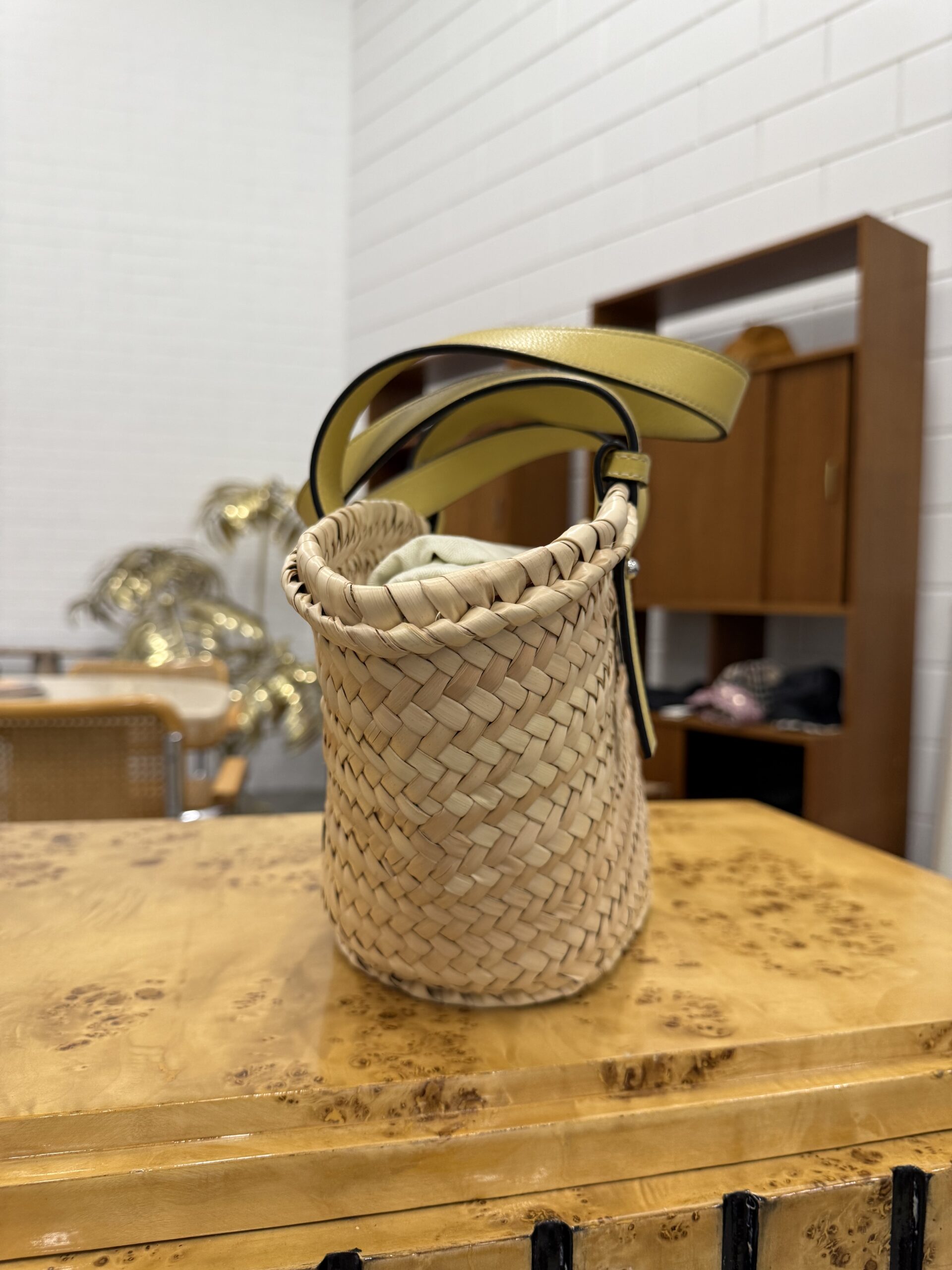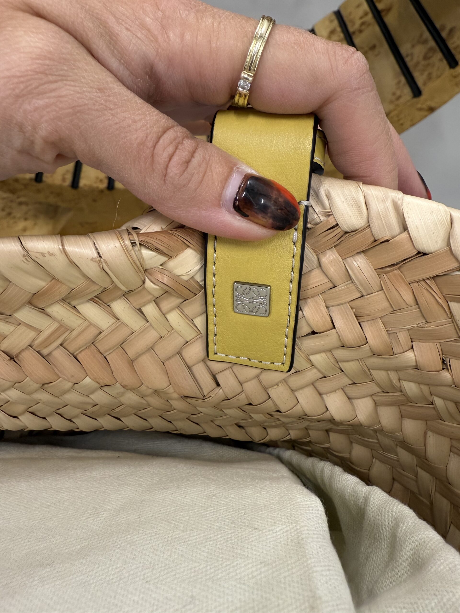 Brand new Loewe Basket bag in small size. Natural Raffia with Calfskin butter yellow handles and Embossed Anagram Patch. Made in Spain. Handles are adjustable. Bag is new and comes with original dustbag.