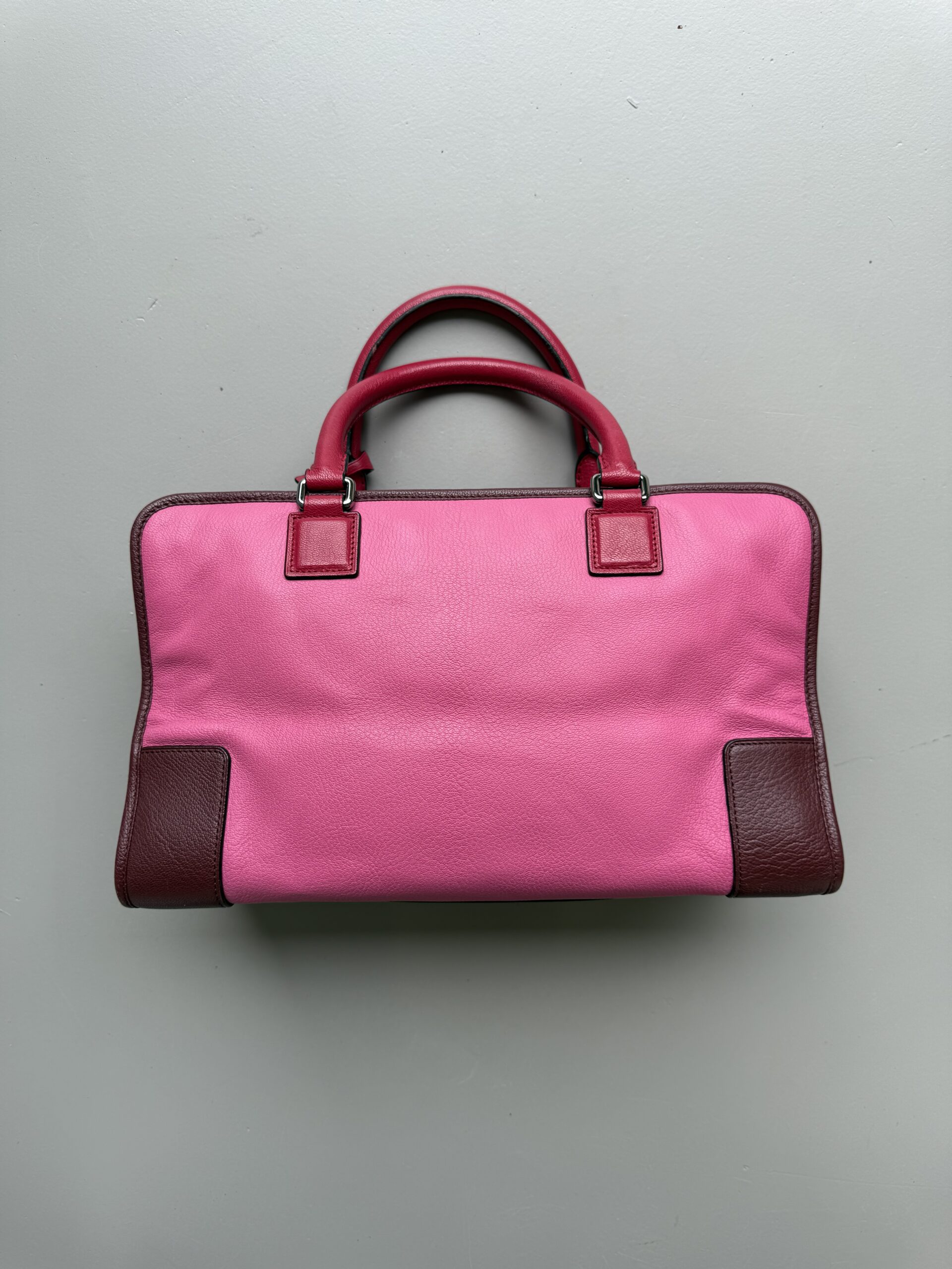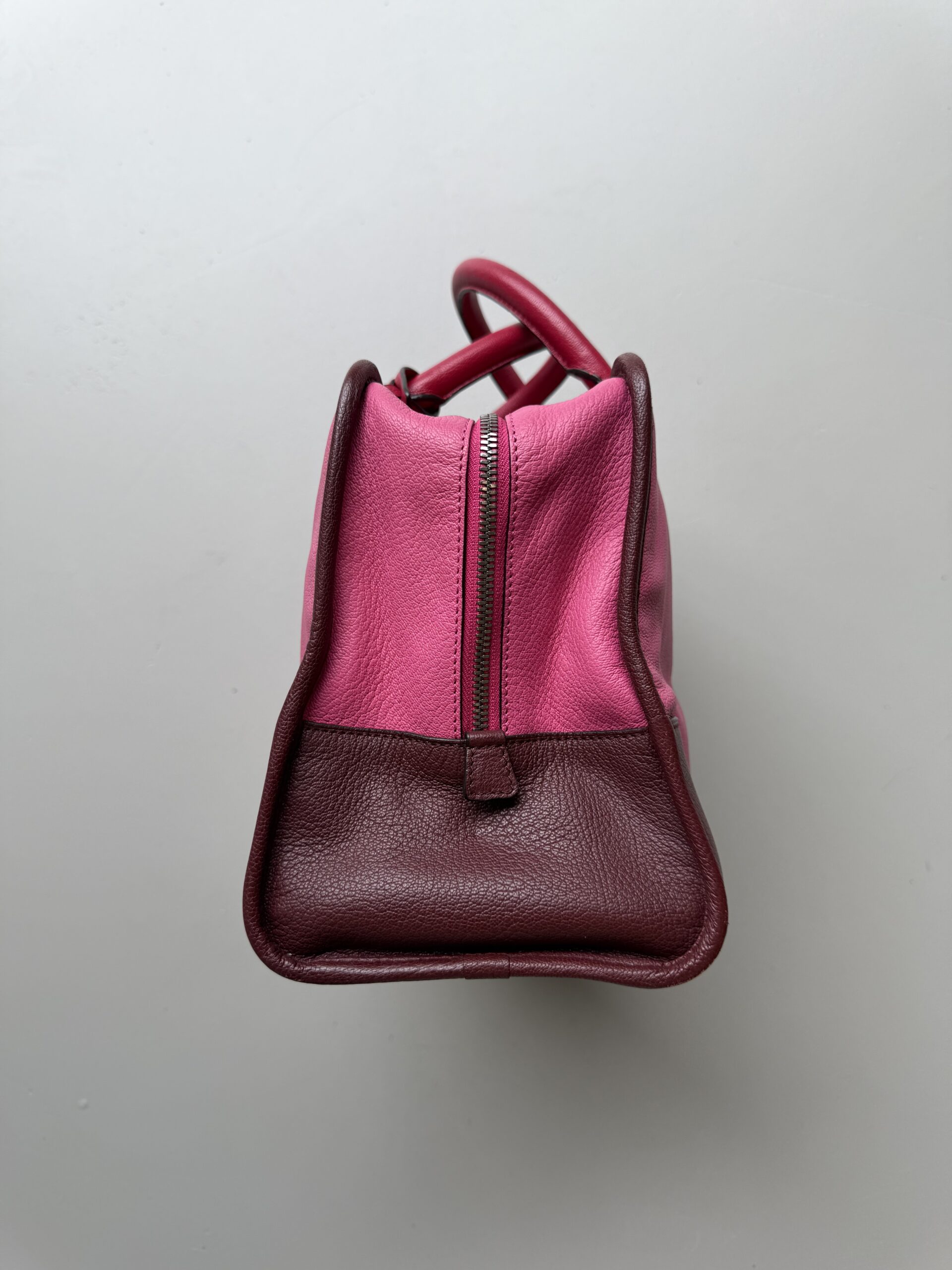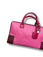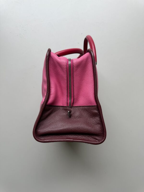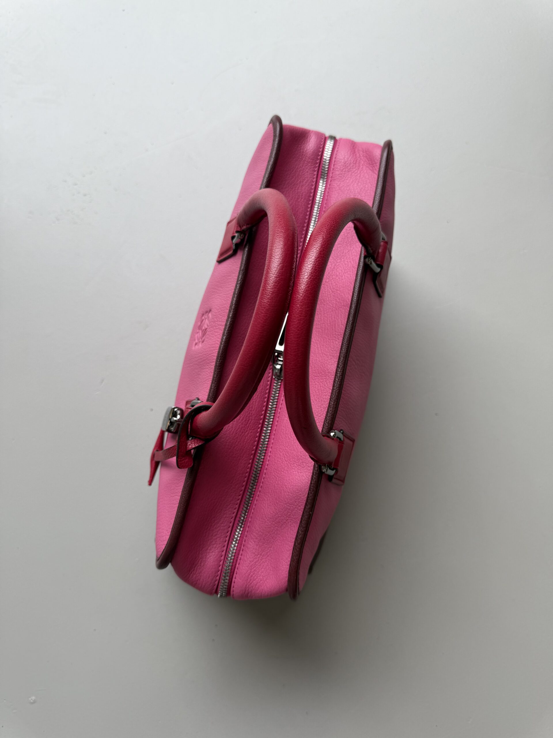 Vintage Loewe Bowling bag in pink and Bordeaux leather. Loewe Anagram Logo in stamped on the front. Silver metal hardware. Bag closes with a zipper. Bag is in brand new condition.