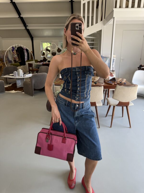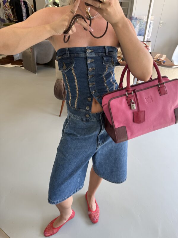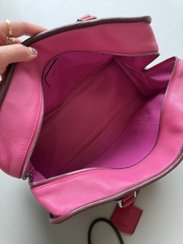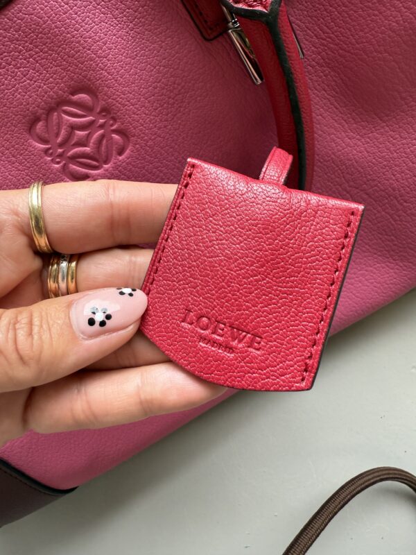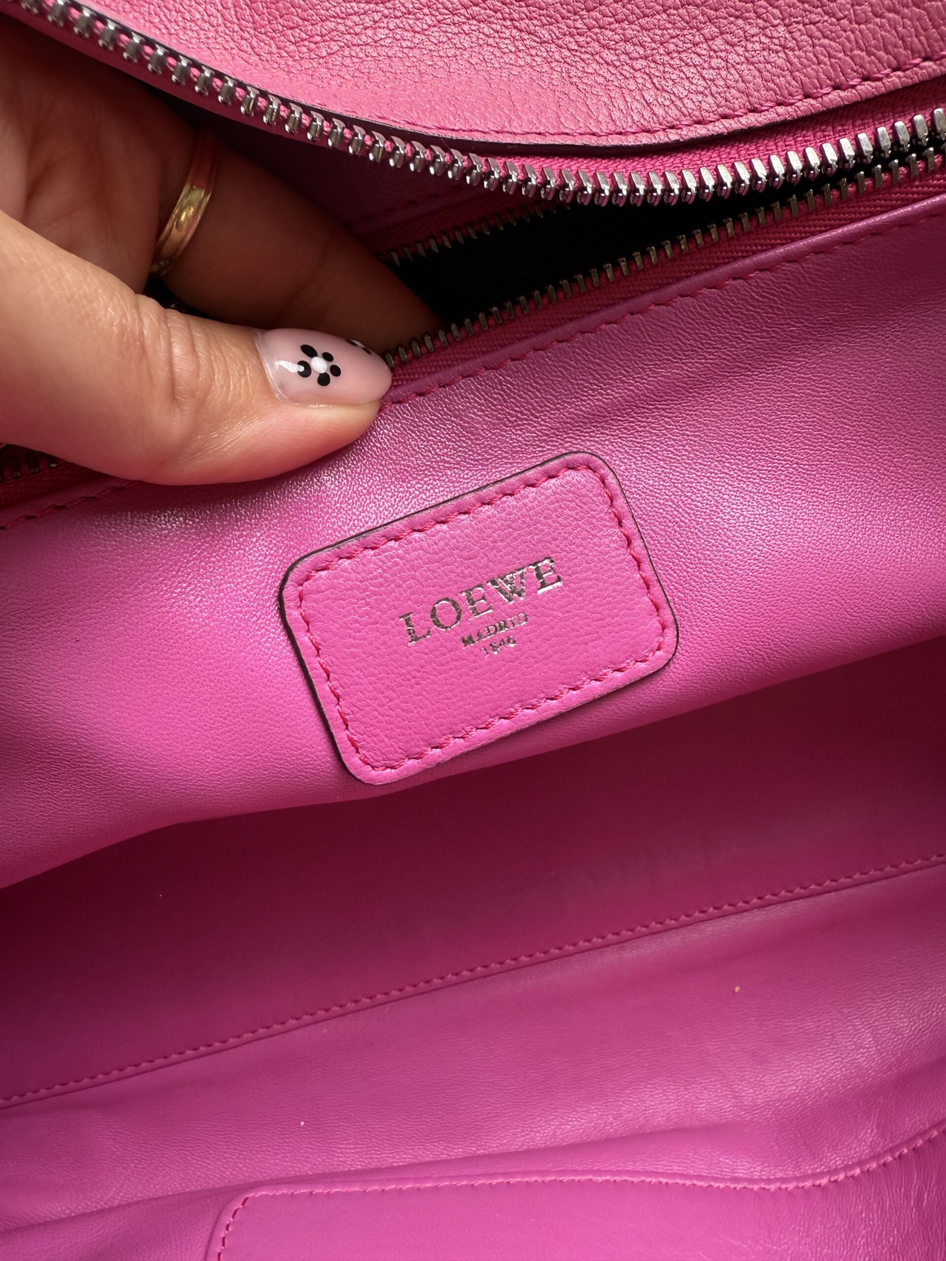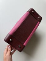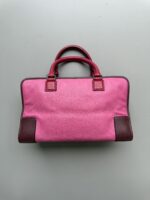 Vintage Loewe Bowling bag in pink and Bordeaux leather. Loewe Anagram Logo in stamped on the front. Silver metal hardware. Bag closes with a zipper. Bag is in brand new condition.