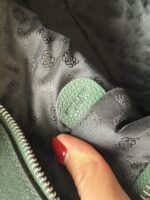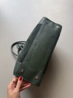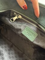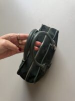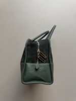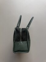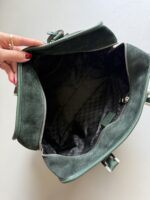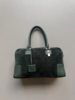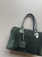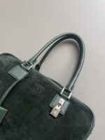 Vintage Loewe Bowling bag in beautiful Green suede and leather. Loewe Anagram Logo in stamped on the front. Silver metal hardware. Bag closes with a zipper. Bag is like new, no real signs of use.