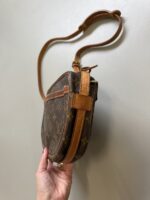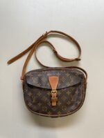 Vintage Louis Vuitton Jeune Fille in very good condition. Classic monogram coated canvas bag with tan leather strap and closure. Golden metal hardware. Pocket on the front which closes with a little belt and buckle. Bag closes with a zipper. Adjustable shoulder strap with shoulder protection part. Bag is still in very good condition. Coated canvas is like new. Leather has some common signs of use as seen in the pictures (no broken or damaged parts). Big compartment inside is in perfect condition. Pocket on the back and inside are quite nice and clean.