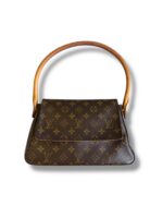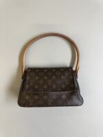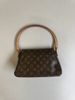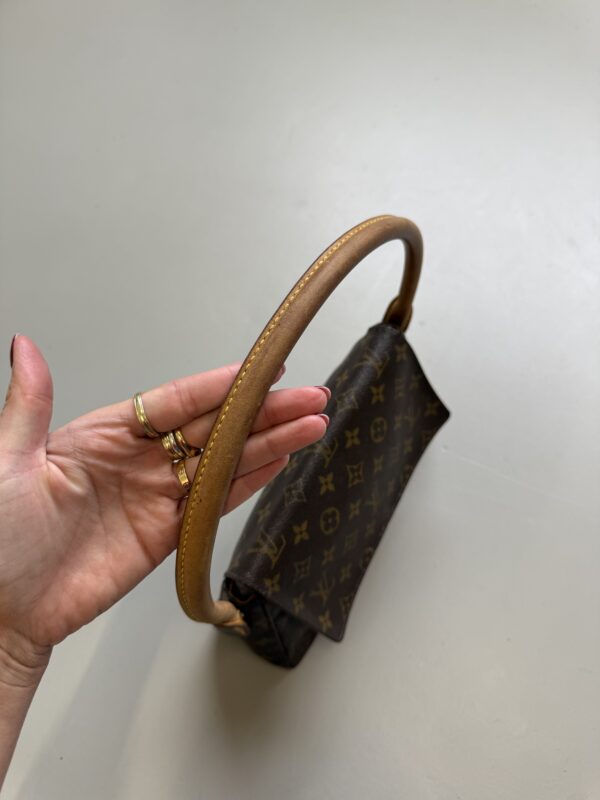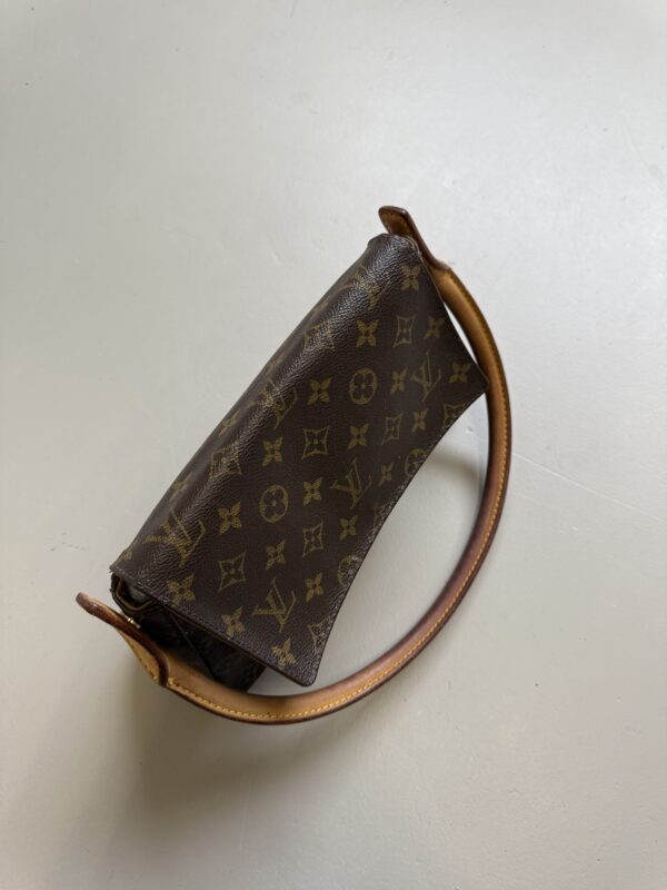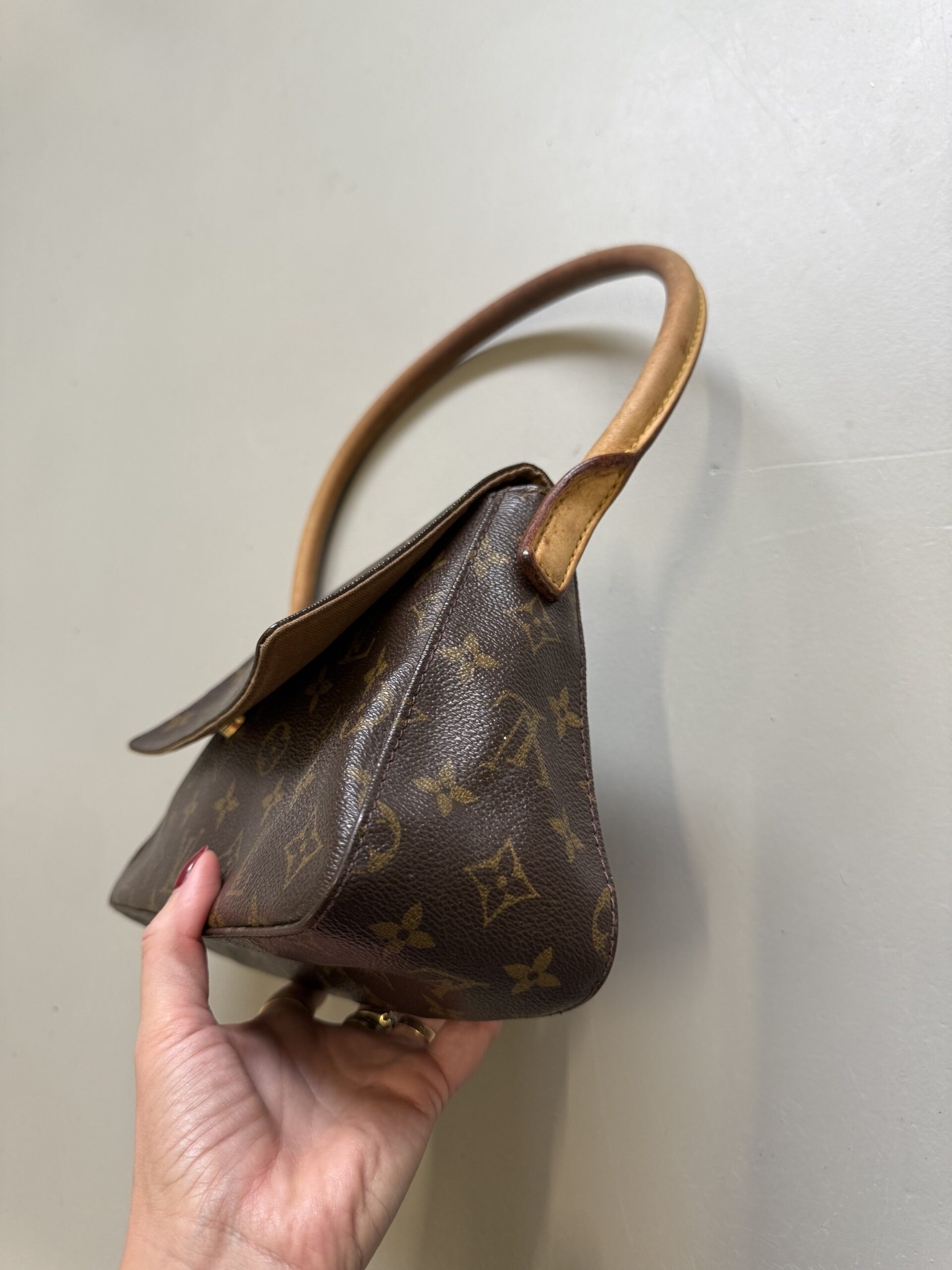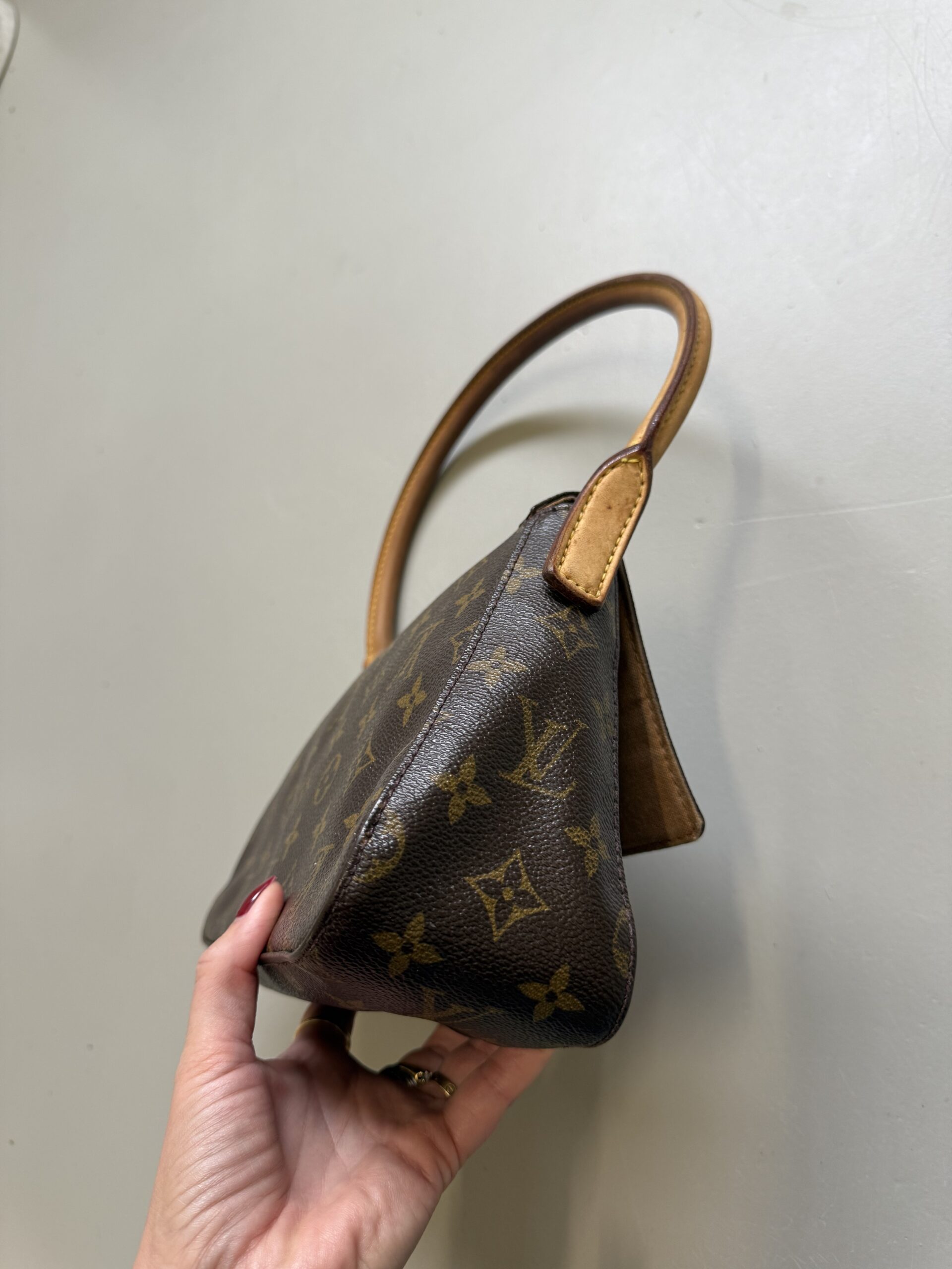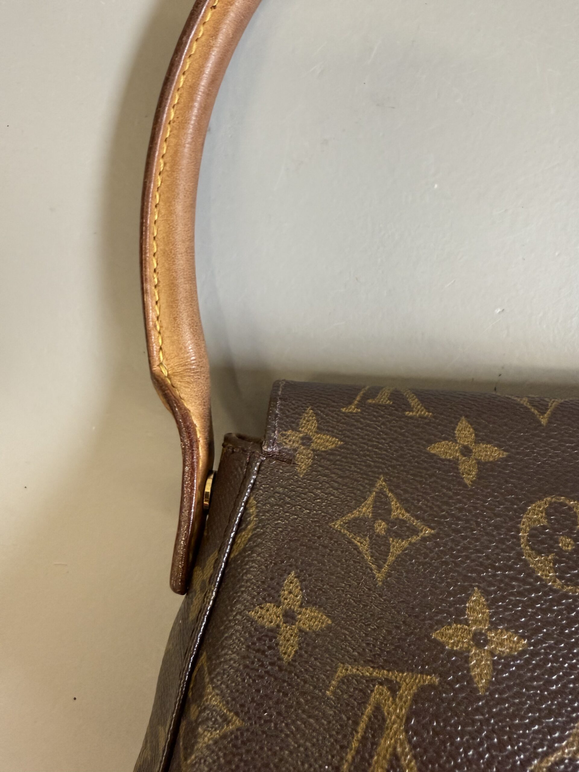 Vintage Louis Vuitton Looping bag PM (small size) with flap. Classic monogram bag in coated canvas with leather details and golden hardware. Bag closes with a flap and magnet. Bag is overall in very good condition. Leather handle is still very light. The coated canvas in overall in very good condition, it has a few very, very tiny cracks in the canvas (very usual for this bag). A few located on the middle front edge of the flap (these are nearly invisible) and a few on the middle front edge and sides of the opening. These can be seen in the pictures. They are super small and have been professionally repaired/glued so only visible when looking really, really closely. Inside is in perfect condition.