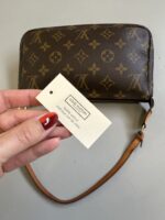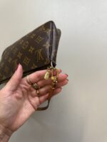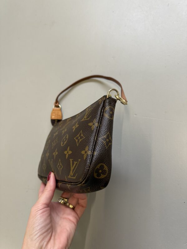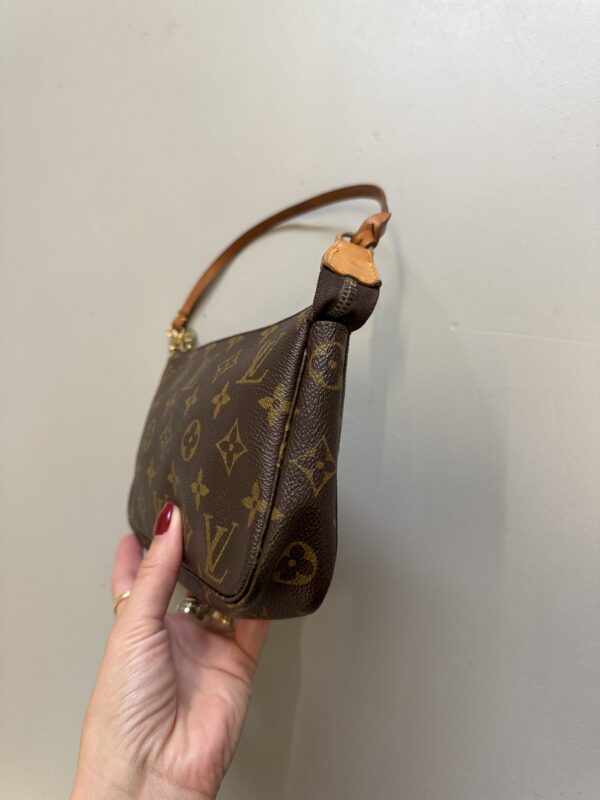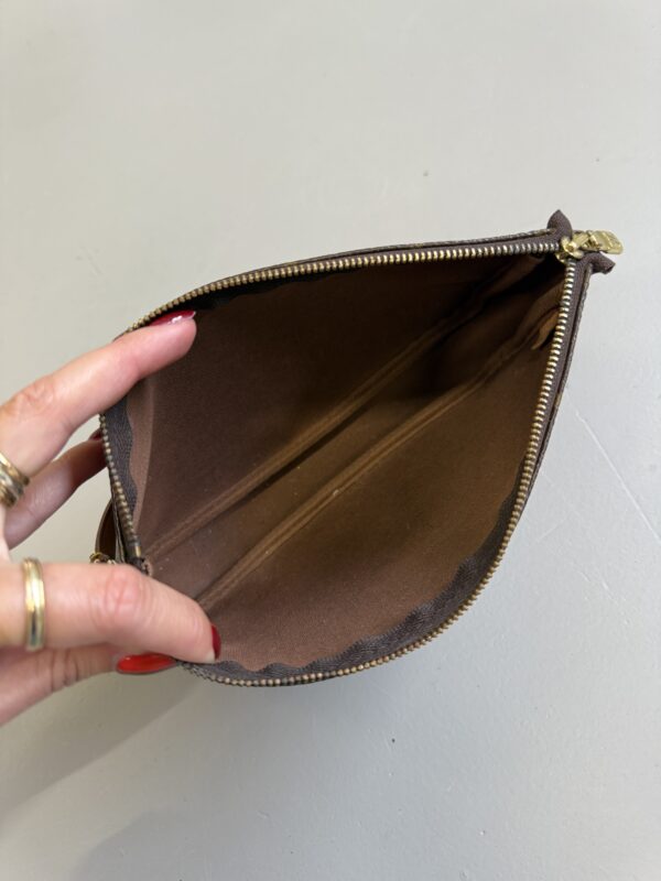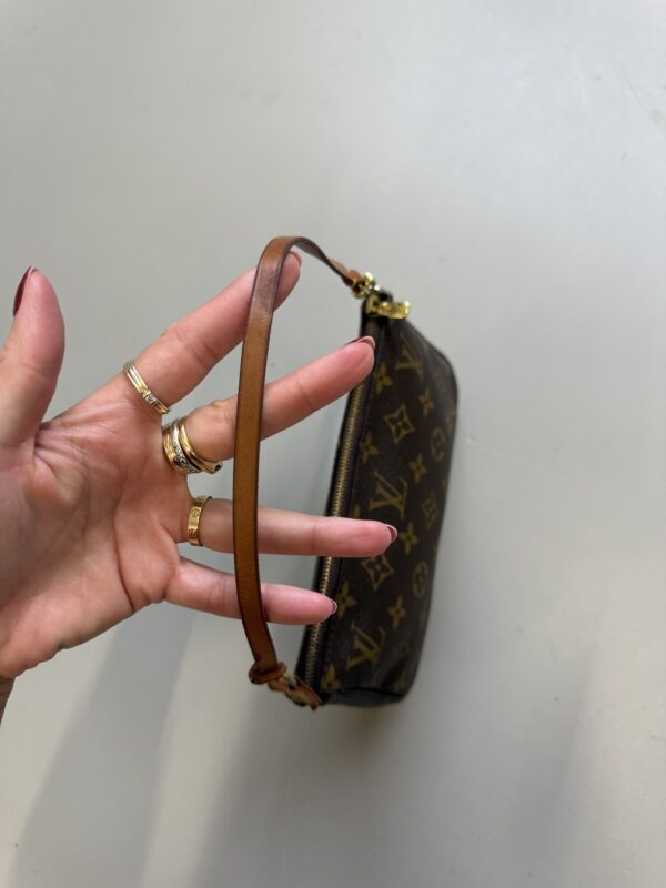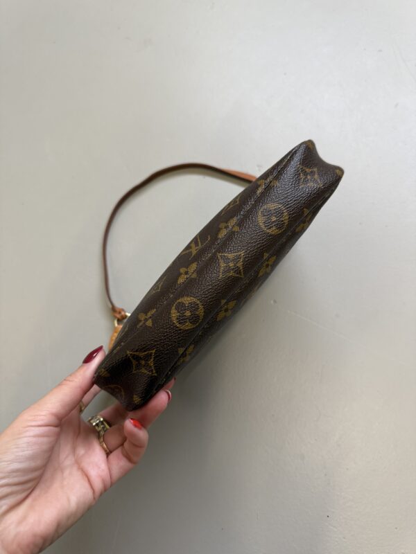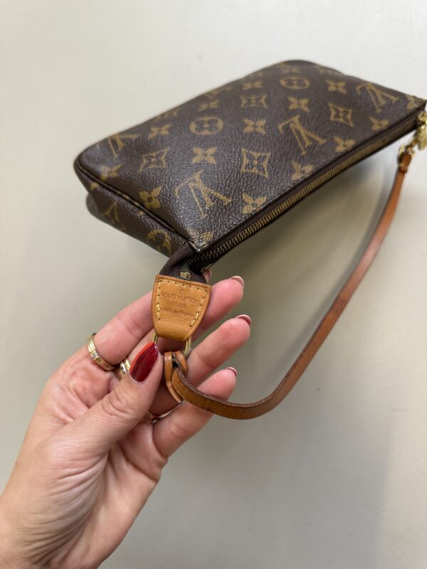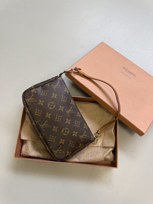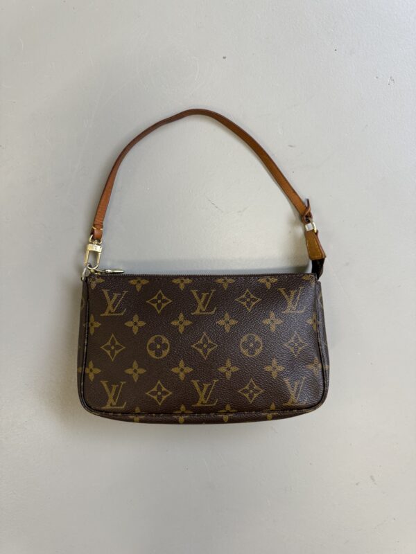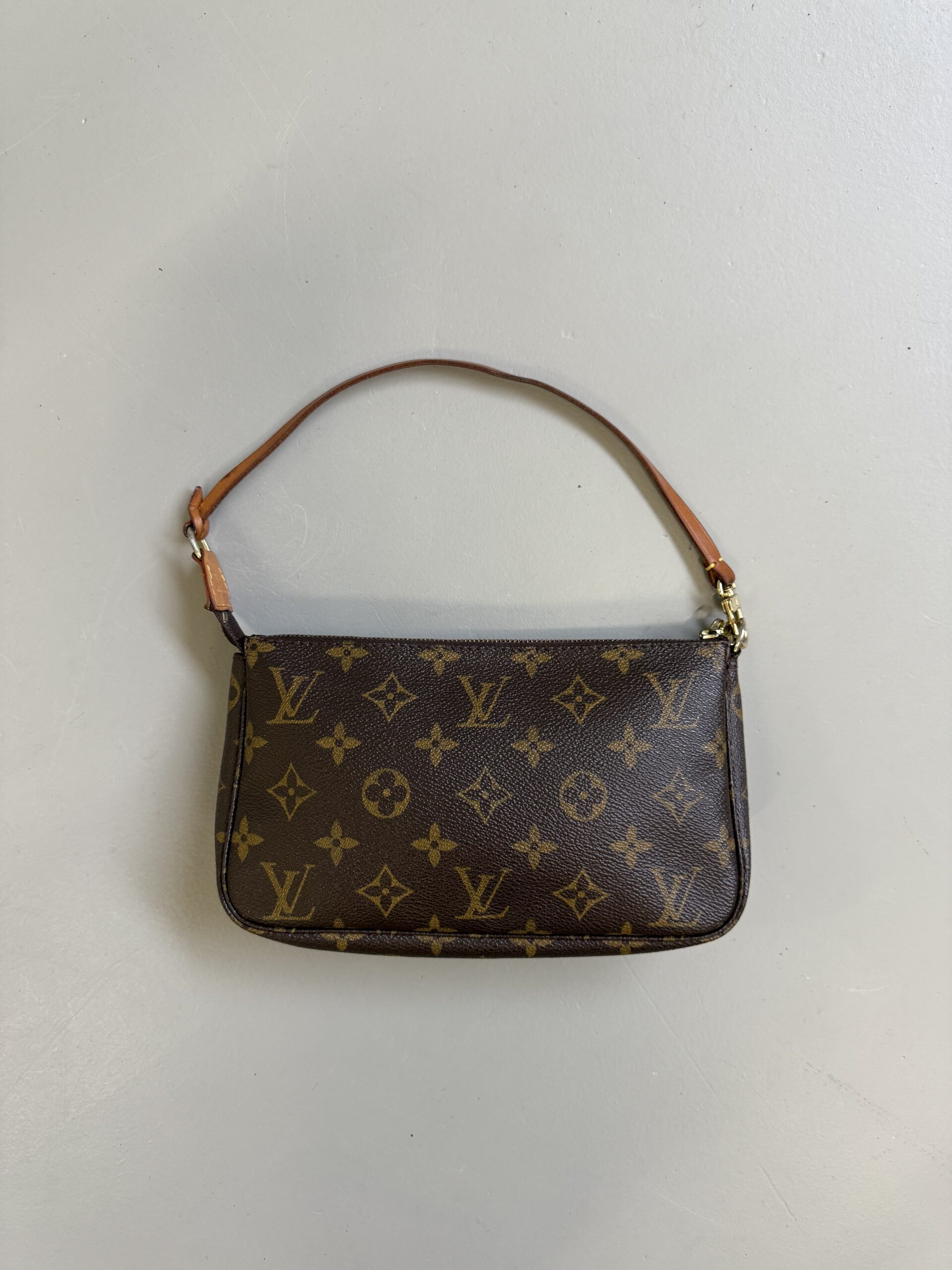 Vintage Louis Vuitton Pochette in amazing condition. Classic coated canvas bag with tan leather details and golden metal hardware. Coated canvas is in perfect condition. The tan leather is still very light for its age. The leather strap is still very nice and light in color. The golden hardware is also still in amazing condition. Inside also in perfect condition.