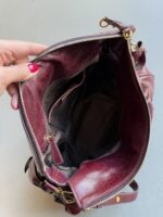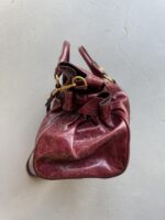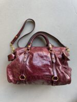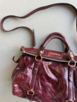 Vintage Miu Miu Vitello Lux bow bag in a beautiful bordeaux colored leather with golden metal hardware. Medium size. Very detailed bag with golden metal rings, bows on the sides and studs. Bag closes with zipper and flap. Golden metal Miu Miu logo on the front. Comes with extra crossbody strap. Bag is in amazing condition. Inside is in perfect condition too.