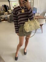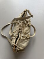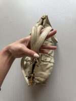 Vintage Miu Miu Vitello Lux Gathered bag in a beautiful cloud colored leather with golden metal hardware. Small size. Very detailed bag with golden metal rings, pleated sides and studs. Gathered opening which closes with a magnet. Comes with extra crossbody strap. Bag is in amazing condition. Very light signs of use on the upper edges and handles, almost unnoticeable. Inside is in perfect condition too.