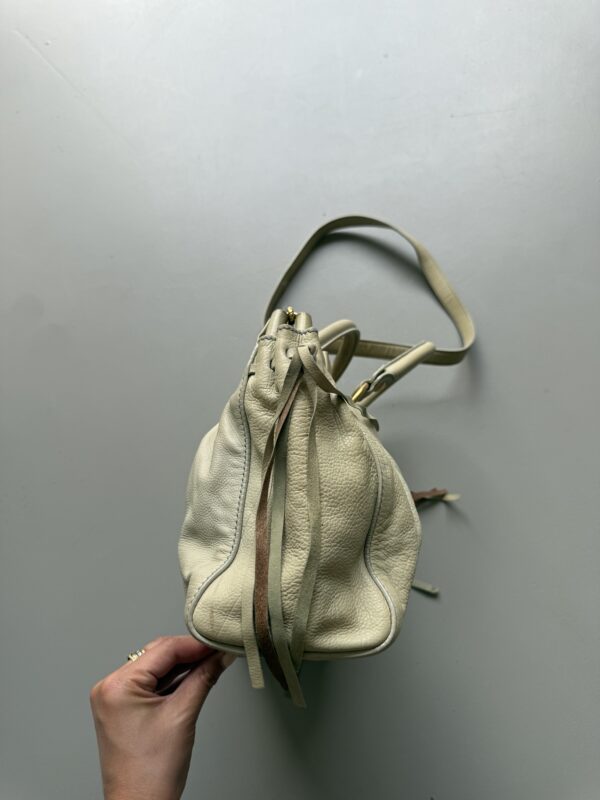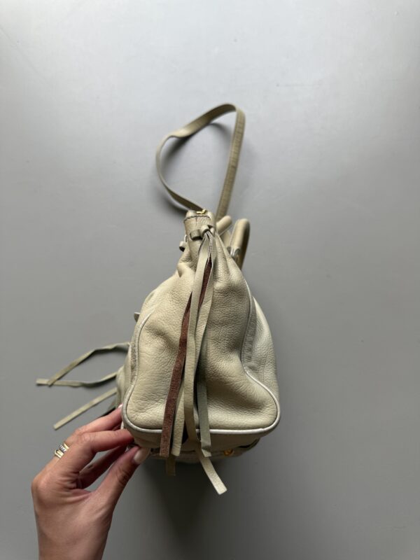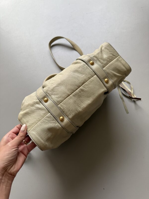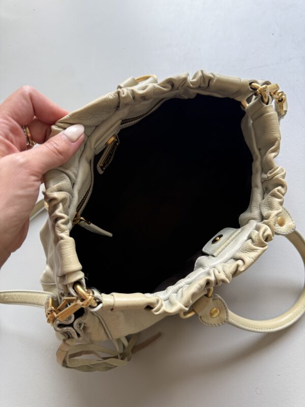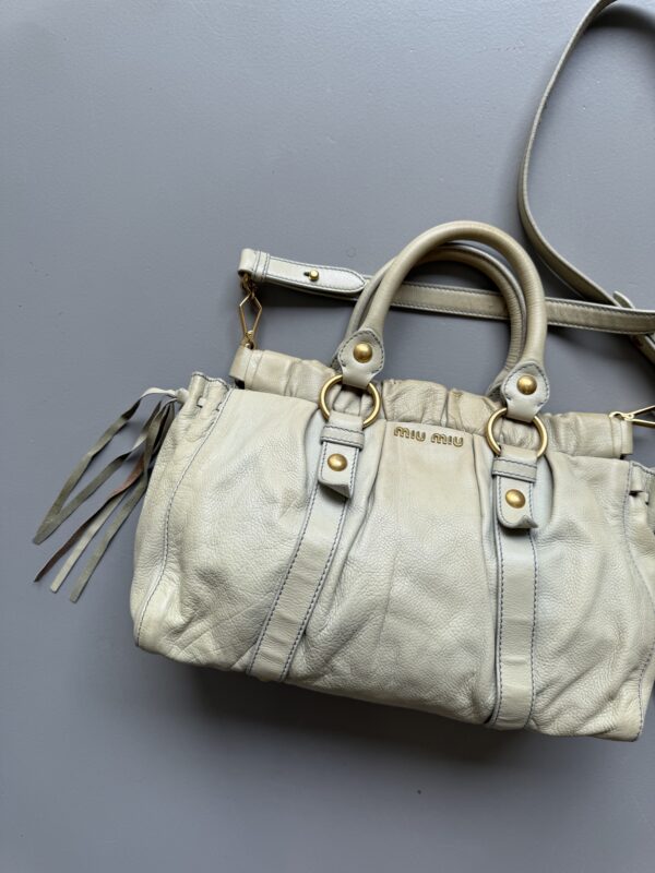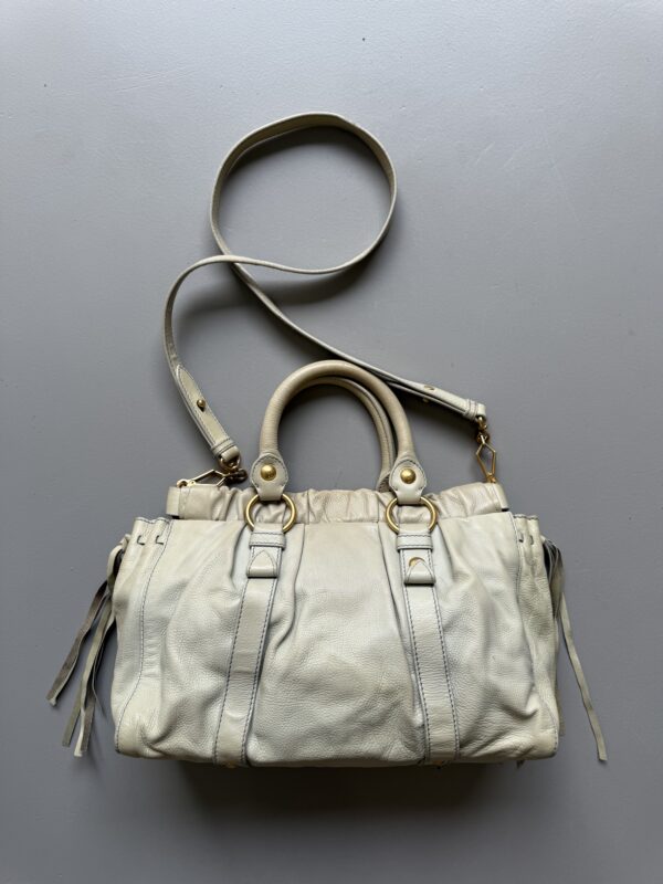 Vintage Miu Miu Vitello Lux Gathered bag in a beautiful cloud colored leather with golden metal hardware. Small size. Very detailed bag with golden metal rings, pleated sides and studs. Gathered opening which closes with a magnet. Comes with extra crossbody strap. Bag is in amazing condition. Very light signs of use on the upper edges and handles, almost unnoticeable. Inside is in perfect condition too.