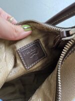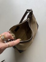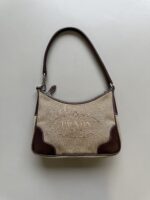 Vintage Prada Jacquard Logo shoulder bag in canvas with dark brown leather details and silver metal hardware. Prada logo big in jacquard on the front. Dark brown leather corners, bottom and strap. Bag closes with a zipper. Bag is in amazing condition, one very tiny glue mark on the back of the bag as seen in the pictures. Not noticeable. Overall like new. Bag can be worn over the shoulder or by hand.