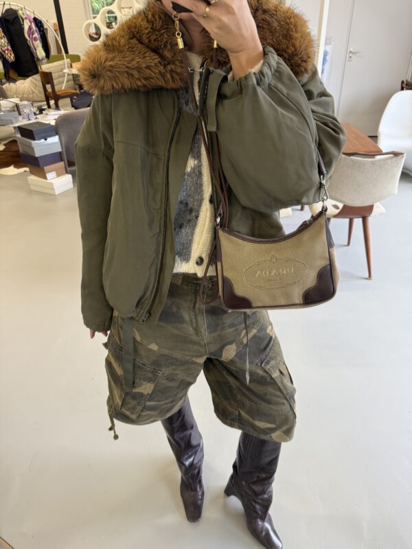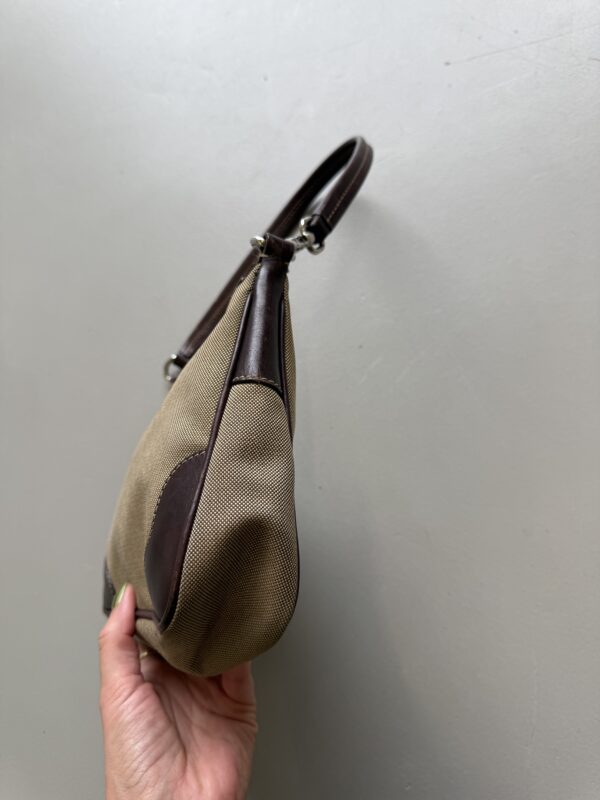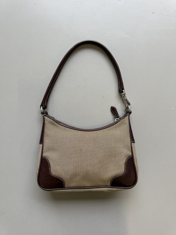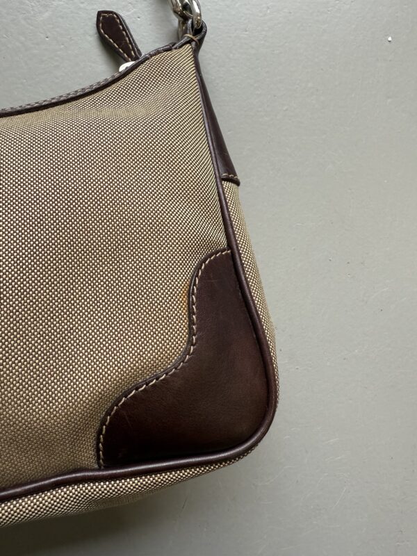 Vintage Prada Jacquard Logo shoulder bag in canvas with dark brown leather details and silver metal hardware. Prada logo big in jacquard on the front. Dark brown leather corners, bottom and strap. Bag closes with a zipper. Bag is in amazing condition, one very tiny glue mark on the back of the bag as seen in the pictures. Not noticeable. Overall like new. Bag can be worn over the shoulder or by hand.