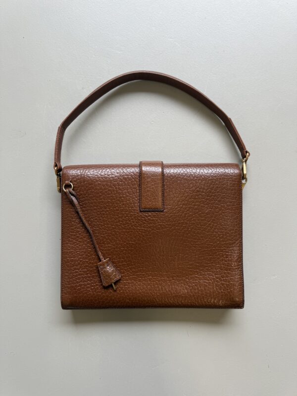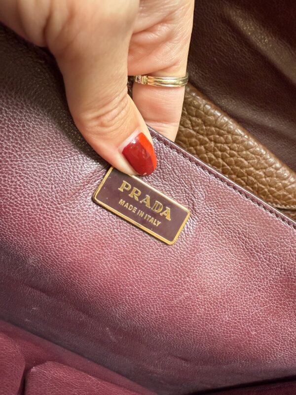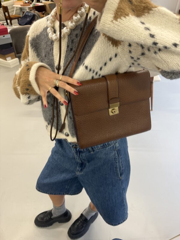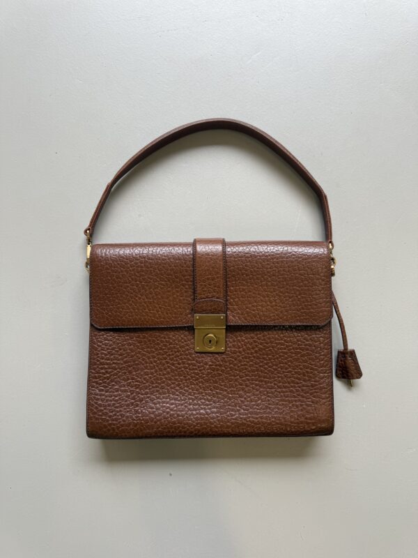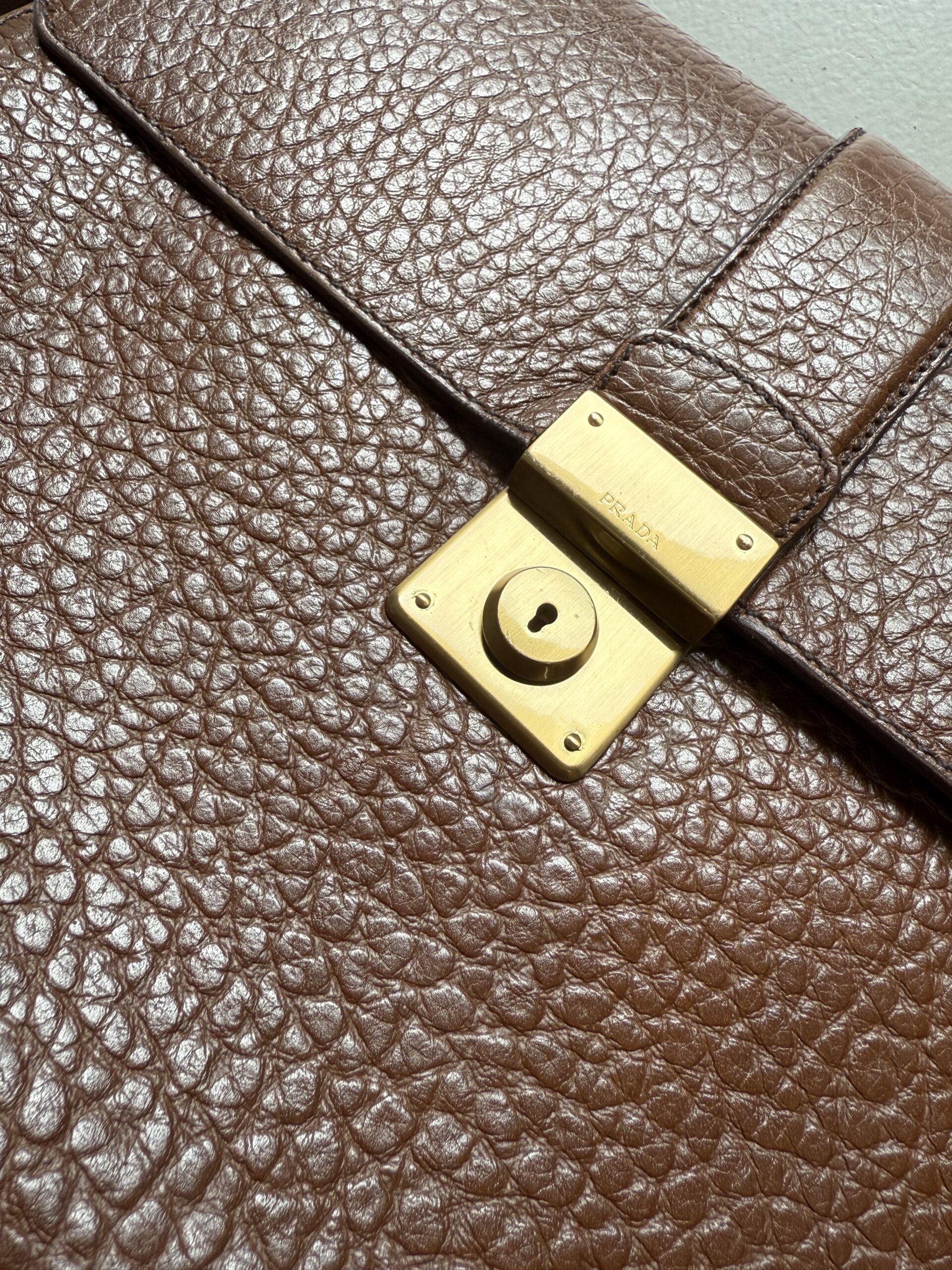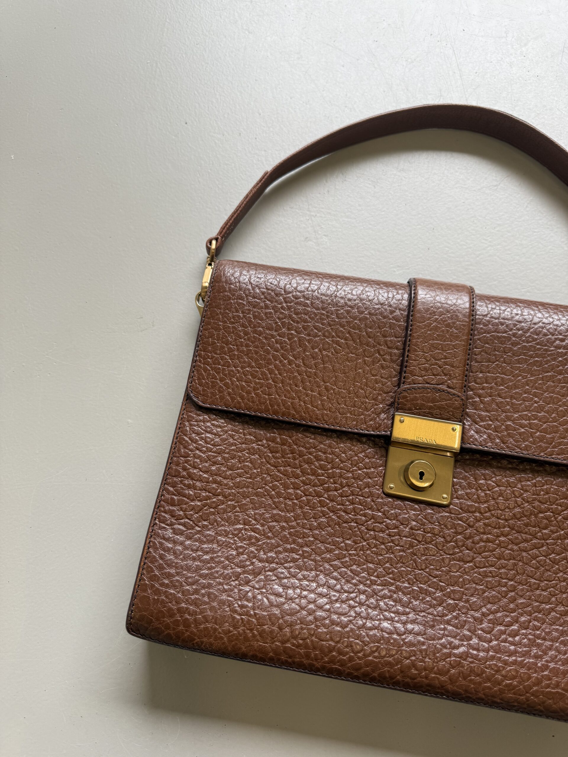 Vintage Prada Brief Case in structured brown leather with golden metal hardware. Square shaped bag closed with flap and clasp. Multiple compartments inside. Matching leather shoulder strap. Bag is in amazing condition. One very light scratch on the leather just underneath the lock. Nearly invisible. Overall like new. Key for the lock included.
