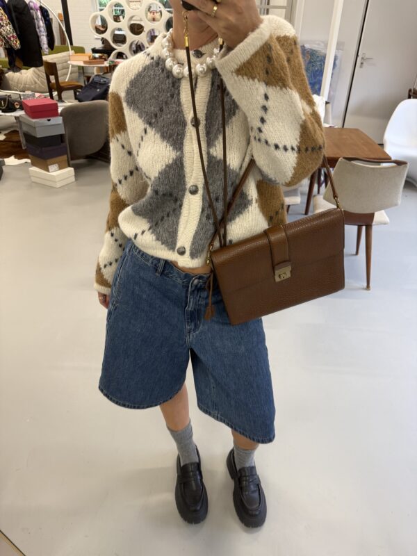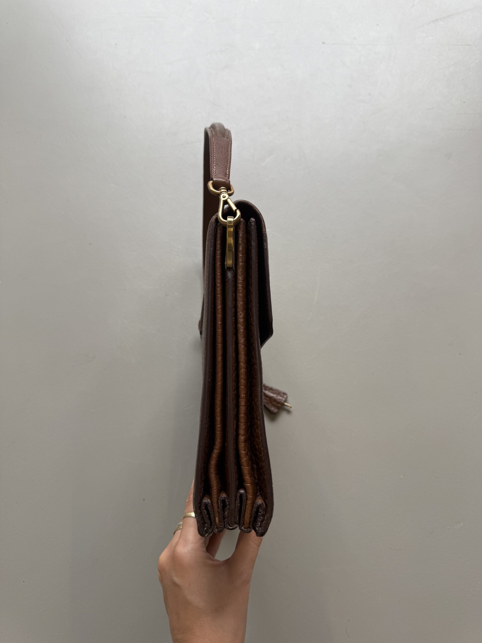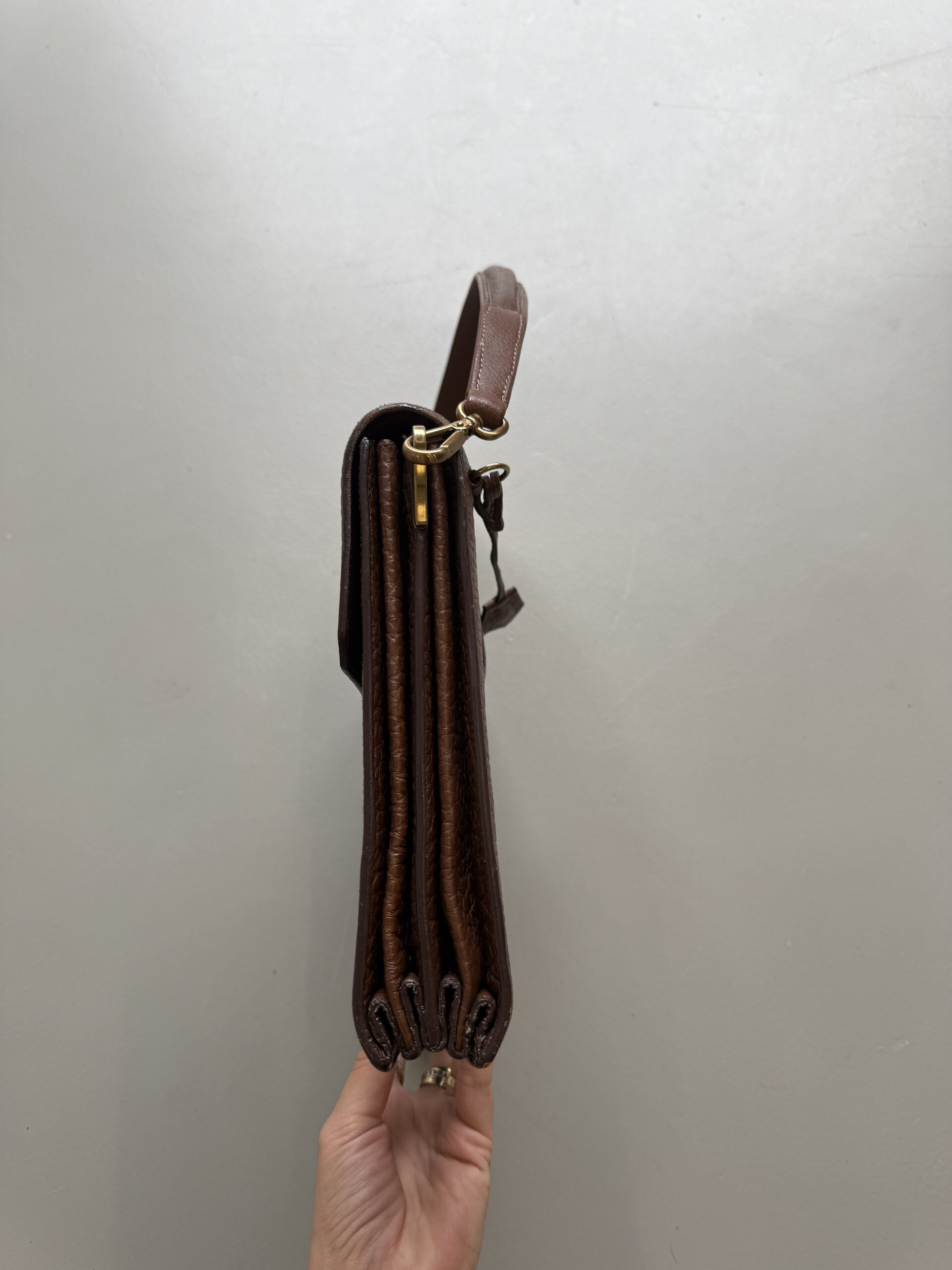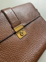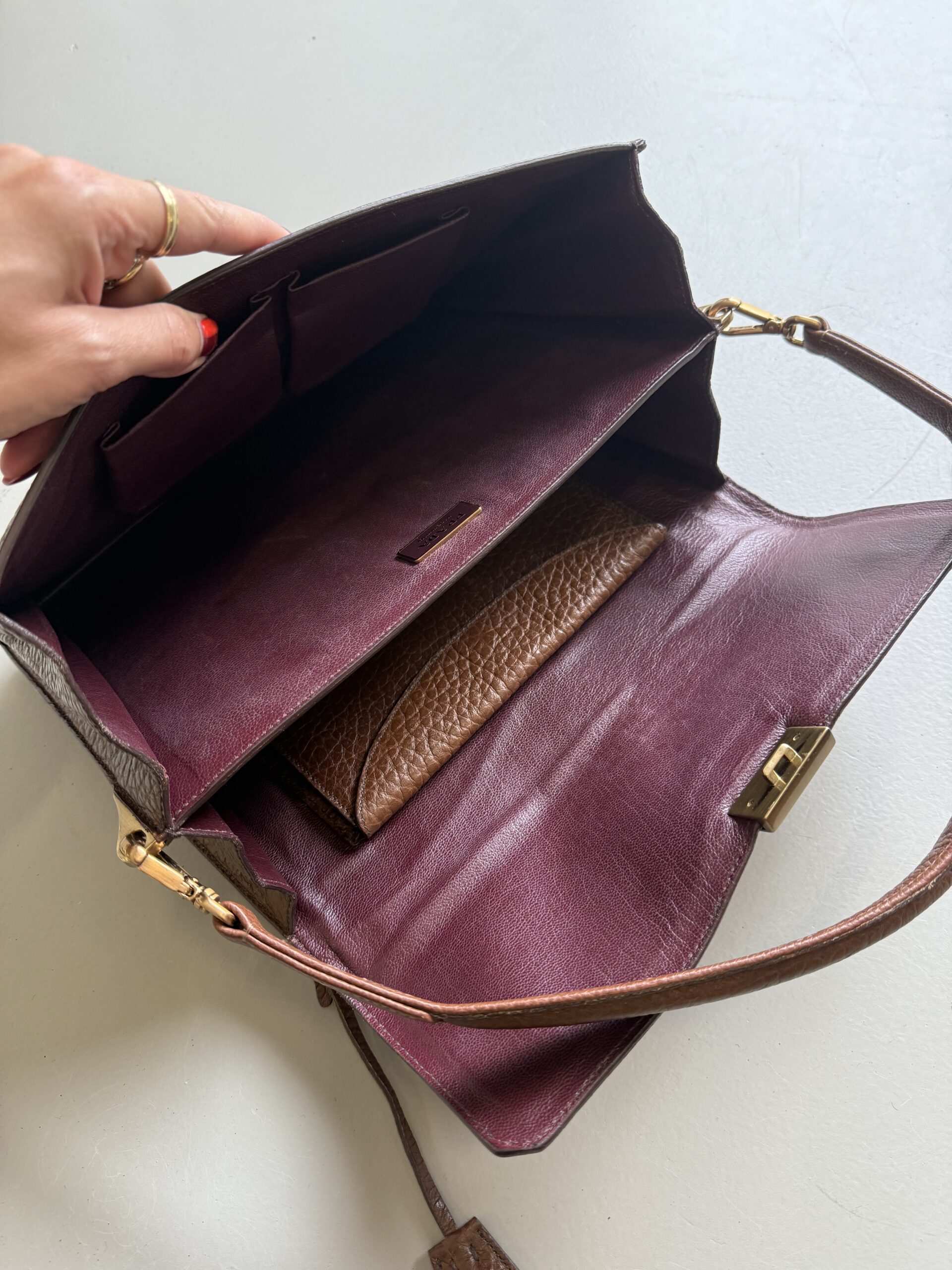 Vintage Prada Brief Case in structured brown leather with golden metal hardware. Square shaped bag closed with flap and clasp. Multiple compartments inside. Matching leather shoulder strap. Bag is in amazing condition. One very light scratch on the leather just underneath the lock. Nearly invisible. Overall like new. Key for the lock included.