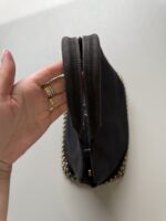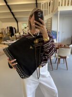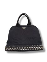 Vintage Prada Shopper in black canvas with studded details in gold and glass. Classic Prada Triangle logo on the front. Bag is still in amazing condition. Very light signs of use on the handles (fabric is a bit lighter here).