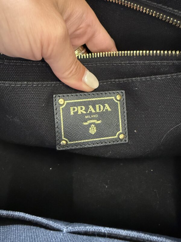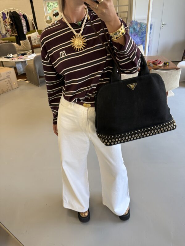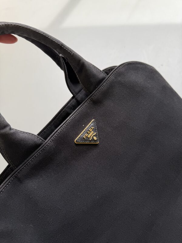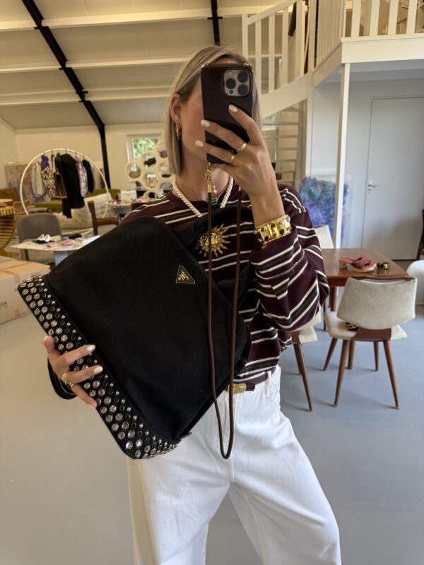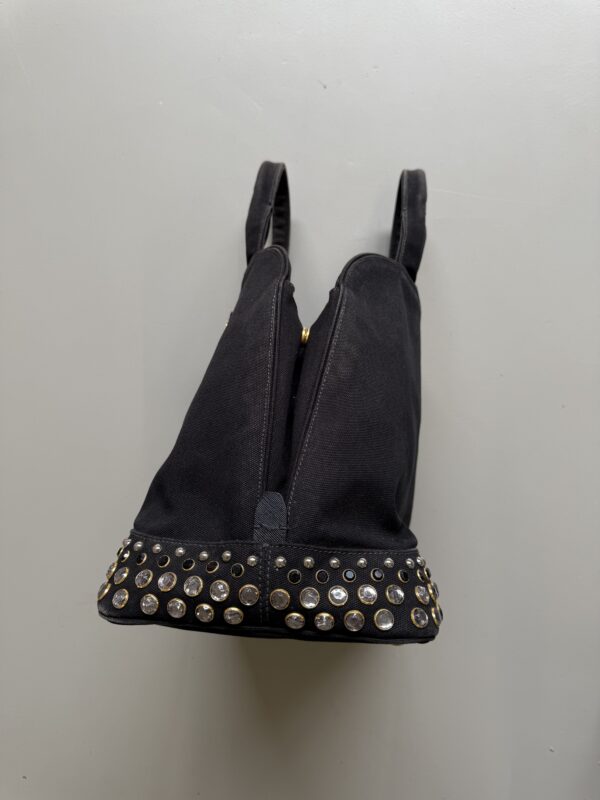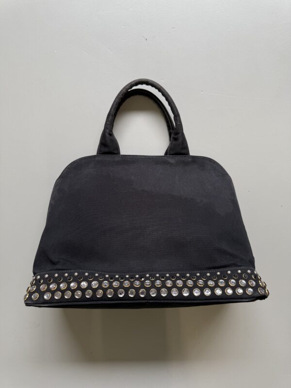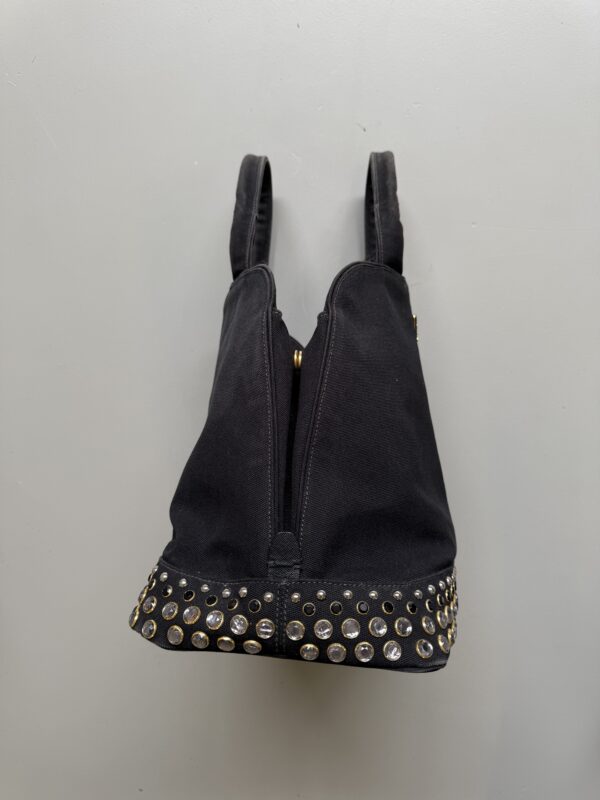 Vintage Prada Shopper in black canvas with studded details in gold and glass. Classic Prada Triangle logo on the front. Bag is still in amazing condition. Very light signs of use on the handles (fabric is a bit lighter here).