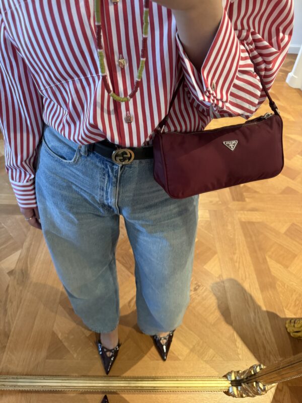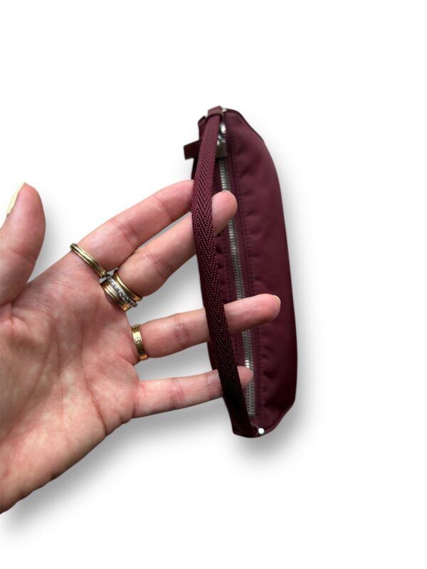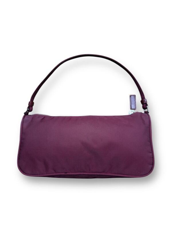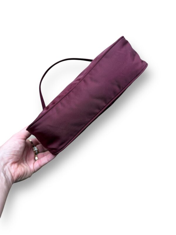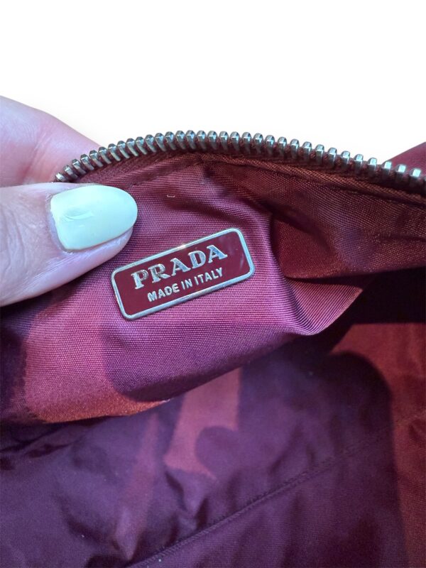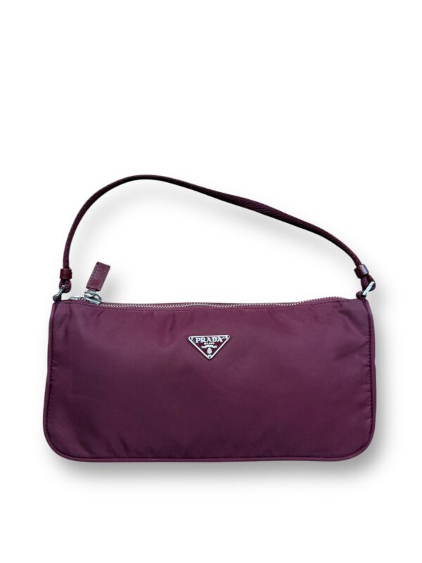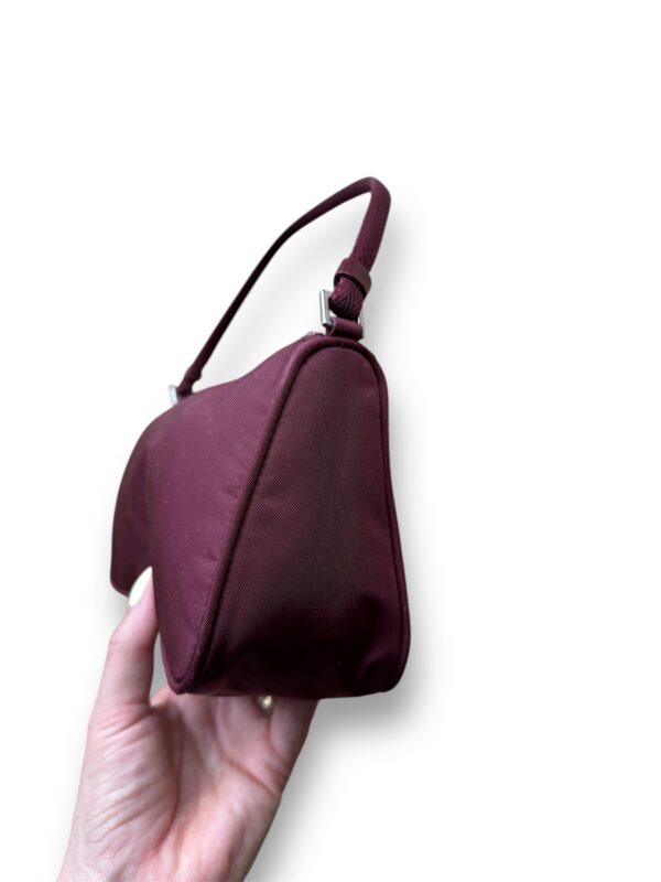 Vintage Prada Tessuto bag in amazing condition. Classic bordeaux nylon bag with nylon strap and silver hardware. Classic Prada Triangle logo on the front. Bag is in brand new condition, no signs of use.